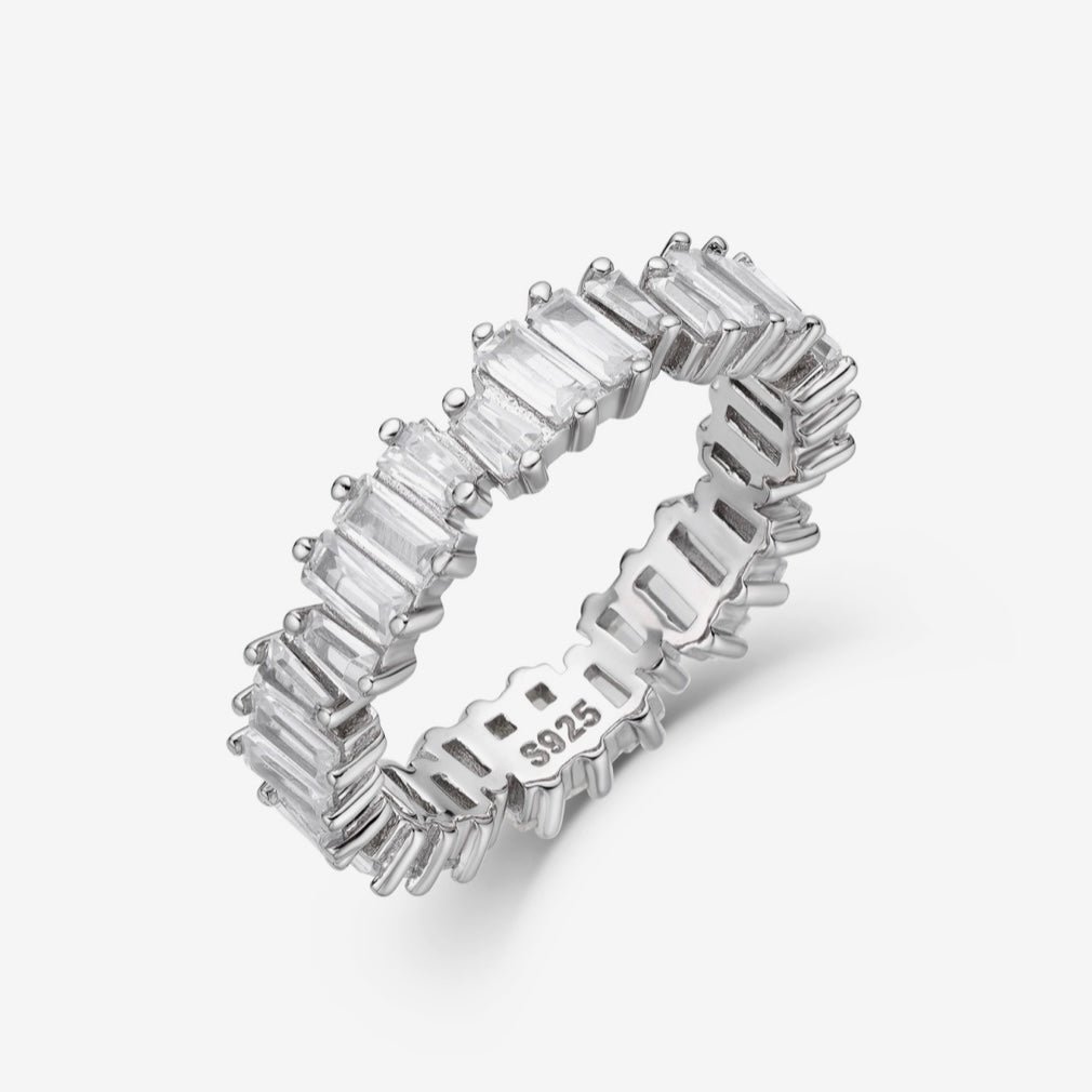 The Baguette ring is an elegant piece of jewellery from the Baguette family. adorned with beautiful baguette-cut stones. Each stone is set in a claw setting to create a stunning play of colours. This stylish ring has been specially designed for the layered look. making it perfect for a variety of outfits and occasions. For special occasions. you can also combine several pieces together to create an even more impressive look. With this ring you will definitely make a statement and add a touch of elegance to your outfit.